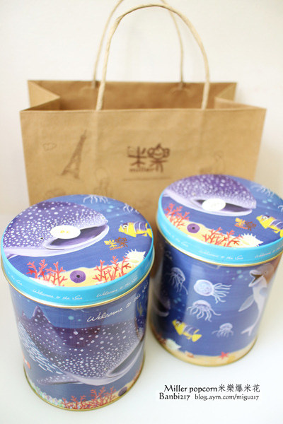 焦糖及巧克力口味爆米花,繪有鯨鯊、海豚、水母等許多海洋生物,非常的清新可愛。