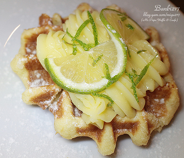 將法式經典甜點檸檬塔與比利時鬆餅真是有創意之結合!將比利時鬆餅取代塔皮部分,上面是濃郁的酸甜檸檬醬,適合喜愛酸甜口味的朋友。