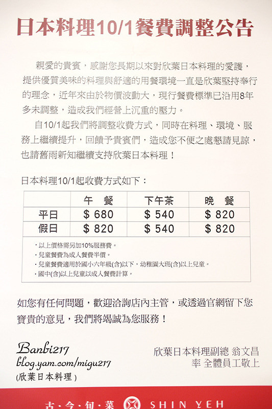 不過10/1號起欣葉日本料理價格即將調漲為:平日午餐$680+10%、平日下午茶$540+10%、平日晚餐及假日午晚餐$820+10%、假日下午茶$540+10%。