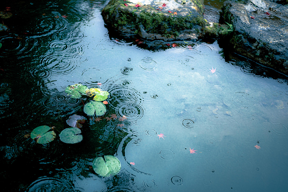 見著雨滴落於蓮池上形成的水波漣漪,是雨天限定的浪漫。