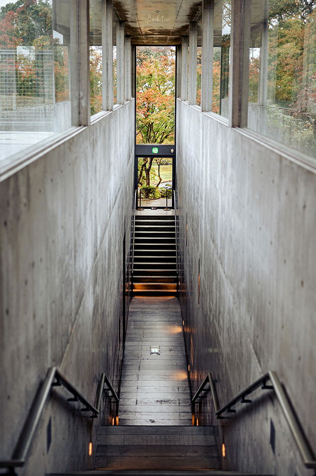由於地中館「地中寶石箱」是設計於地下一樓的展覽區域,連通的樓梯廊道也貫徹了安藤忠雄的清水模風格,更是融入了周圍庭園美景。