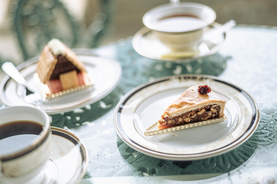 為呼應展覽「こわくて、たのしいスイスの絵本」」(恐怖又有趣的瑞士繪本),做了糖果屋的巧克力草莓蛋糕與瑞士的傳統點心,用核桃與蜂蜜製作的Bündner Nusstorte(中文:格勞賓登核桃派),可搭配紅茶或咖啡。