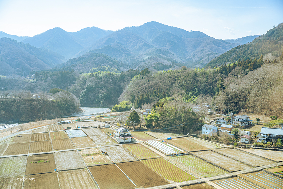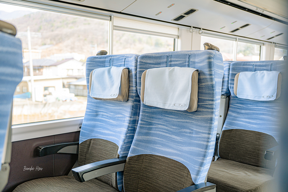 開往山梨區域,車窗外的風景全是綿延的山脈,由於正值3月,山頭還覆蓋著白雪。能見度高時去程往山梨、長野路線,搭左排靠窗位置可看見富士山(大月車站附近),回程往東京方向則是右排靠窗位置可看見富士山。