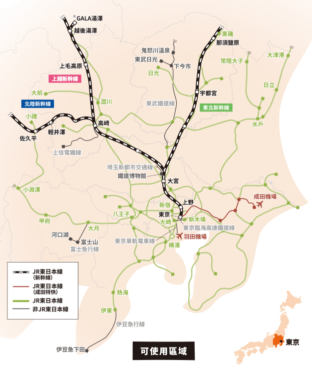 「JR東京廣域周遊券」可使用區域可至大月站、輕井澤、新潟越後湯澤、GALA湯澤、靜岡熱海與伊豆等地區,票價連續三天,大人(12歲以上) 15,000日圓、兒童(6~11歳) 7,500日圓。