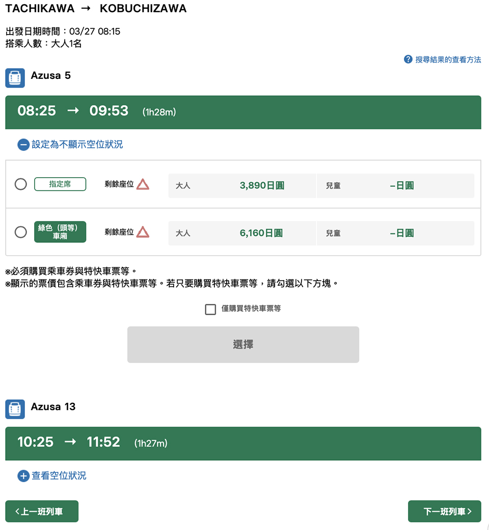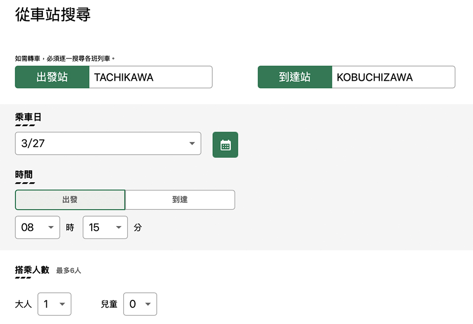在車站輸入地點(若是使用非日文網頁訂票,請記得轉換英文站名,可透過Google查詢,例如我查詢了出發點為立川站、到達站為小淵澤站),以及選擇出發時間和人數。