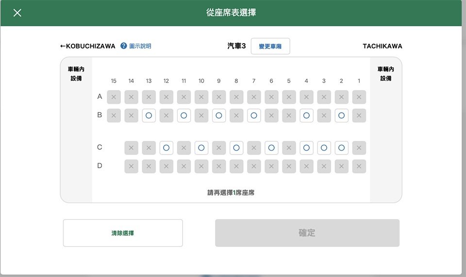 出現了方才搜尋的乘車與下車地點、出發時間和人數可搭乘列車,按下需要的車班「指定席」或者綠色車廂後進行選擇座位→「不指定座席」或是「從座席表選擇」。