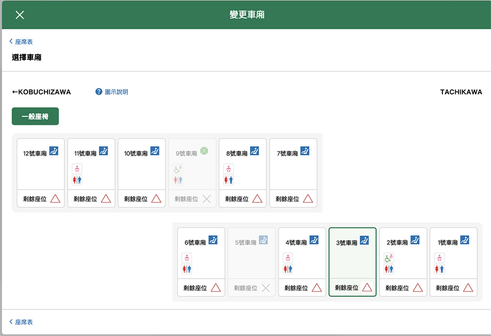 若是系統顯示的車廂位置不適合,可以變更車廂選擇合適的方案,畫面上也會顯示尿布台、洗手間或者無障礙廁所。