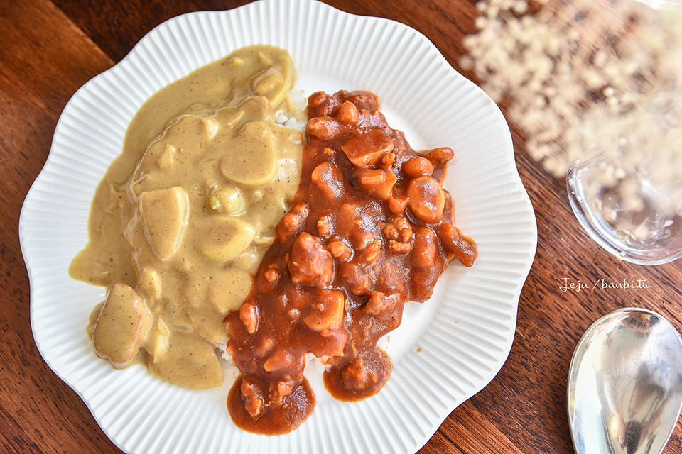 雙色的咖哩飯偏家常日式風味,兩者甜味較重,淡褐色者屬奶味與甜味重型,紅褐色的咖哩則是甜中帶辣,辣度挺夠的。