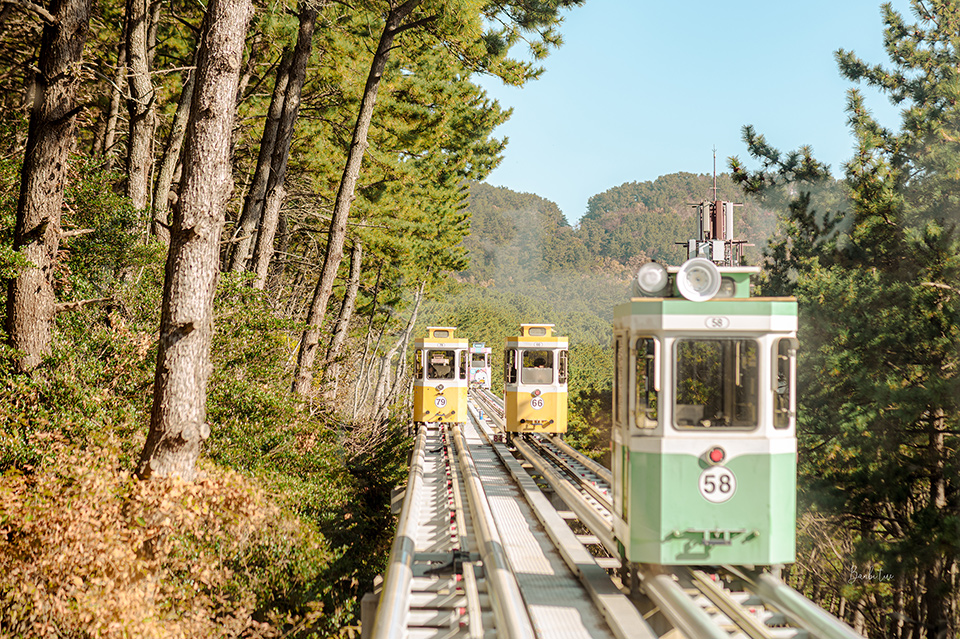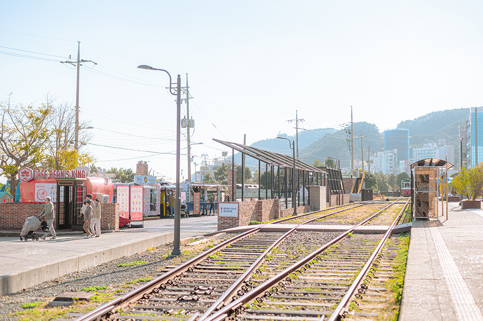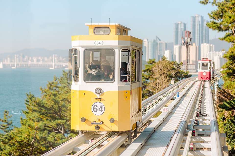 - 此張照片是在尾浦站(미포정거장 / Mipo)拍攝,下方為海岸列車,上面行駛小台的車輛為天空膠囊列車。