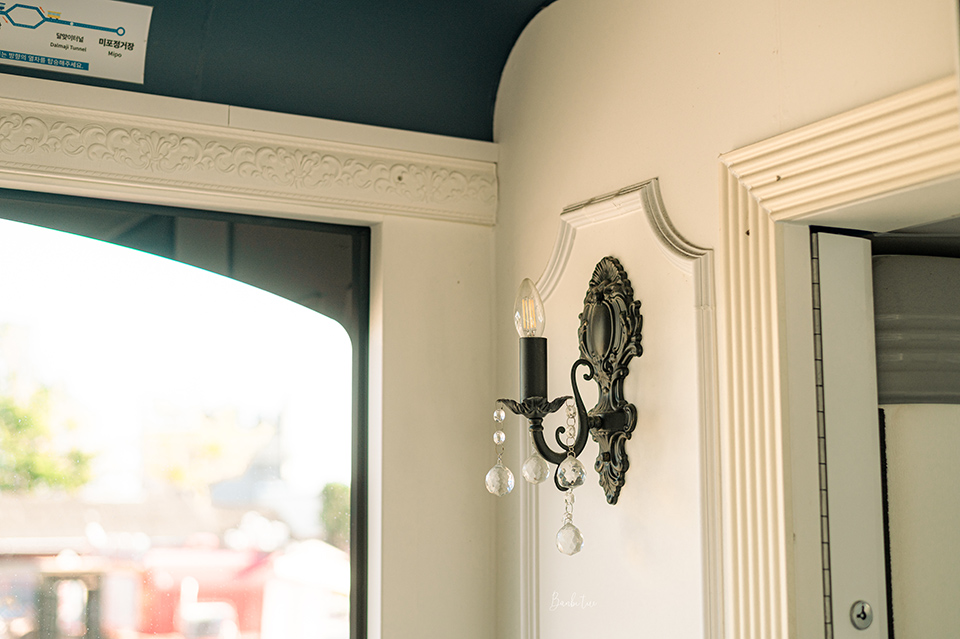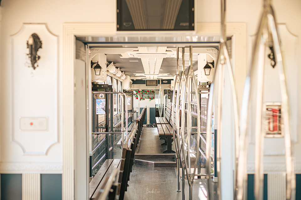 海雲台藍線公園海岸列車 Beach Train,無論是車身外型或是車廂內的設計都很典雅,當我走進車廂內看到這兩排木椅以及復古壁燈,那瞬間想起了教堂。