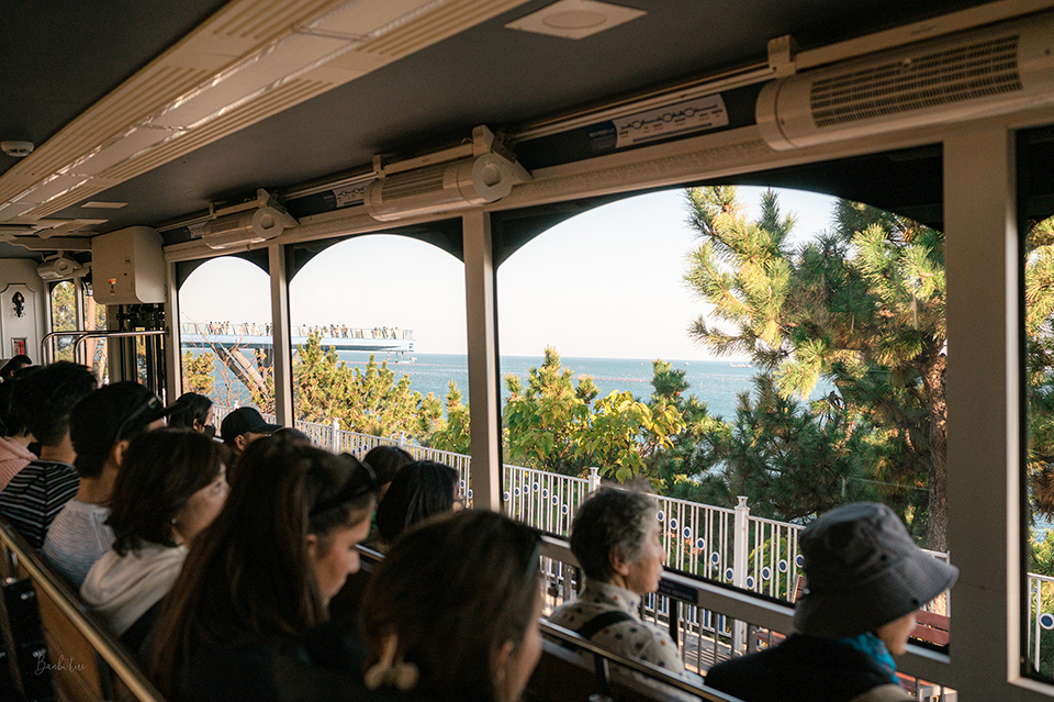 一整面面向海岸行駛的海岸列車,就像是把一整片海洋包了下來,坐著旅行就能被蔚藍色的海填滿所有目光。經過青沙浦站附近時看到海、松林還有青沙浦天空步道,海之都釜山的美,要好好感受,傍晚想必很美吧。