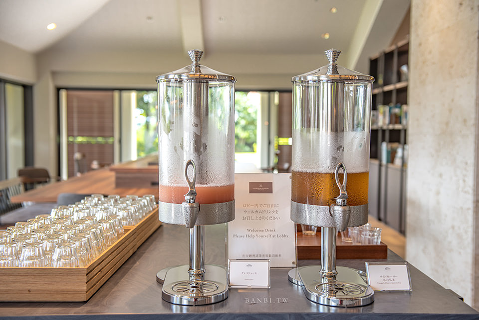 每到下午時,「富崎海灘渡假酒店 FUSAKI BEACH RESORT HOTEL&VILLAS」便會準備兩種不同的茶飲或果汁,讓房客或者來富崎海灘、天使碼頭的旅客也能夠消暑解渴,非常貼心,而我最喜歡的就是紅心芭樂汁。