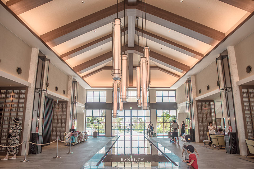 抵達富崎海灘渡假酒店大廳後,到一旁的櫃檯排隊等待辦理登記入住手續,在等候辦理的空檔,若是和家人、朋友一起前來旅遊的旅客,也可在大廳坐著歇息。