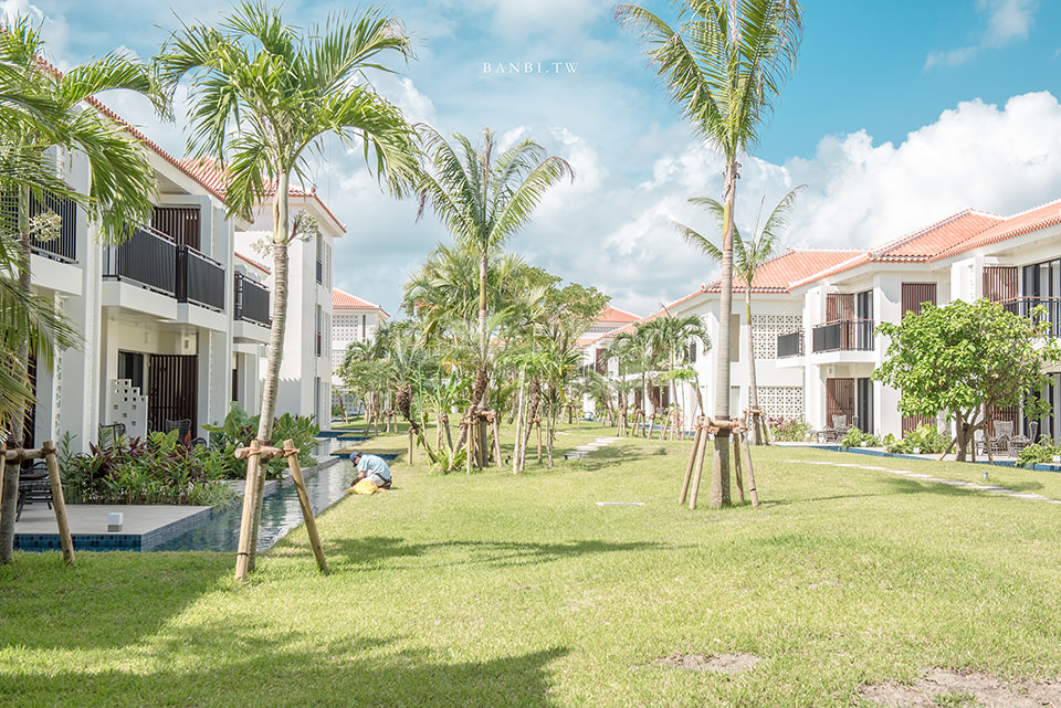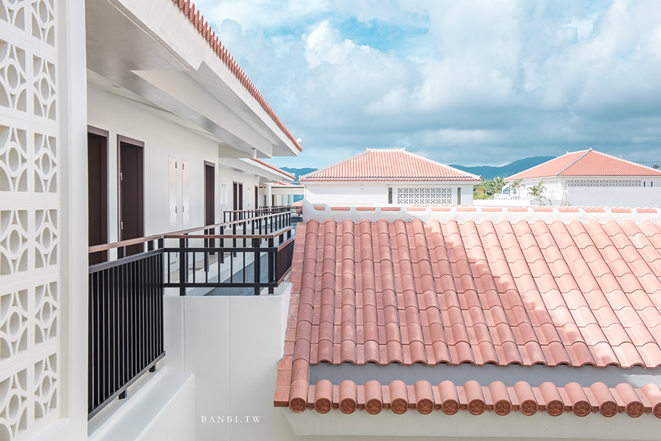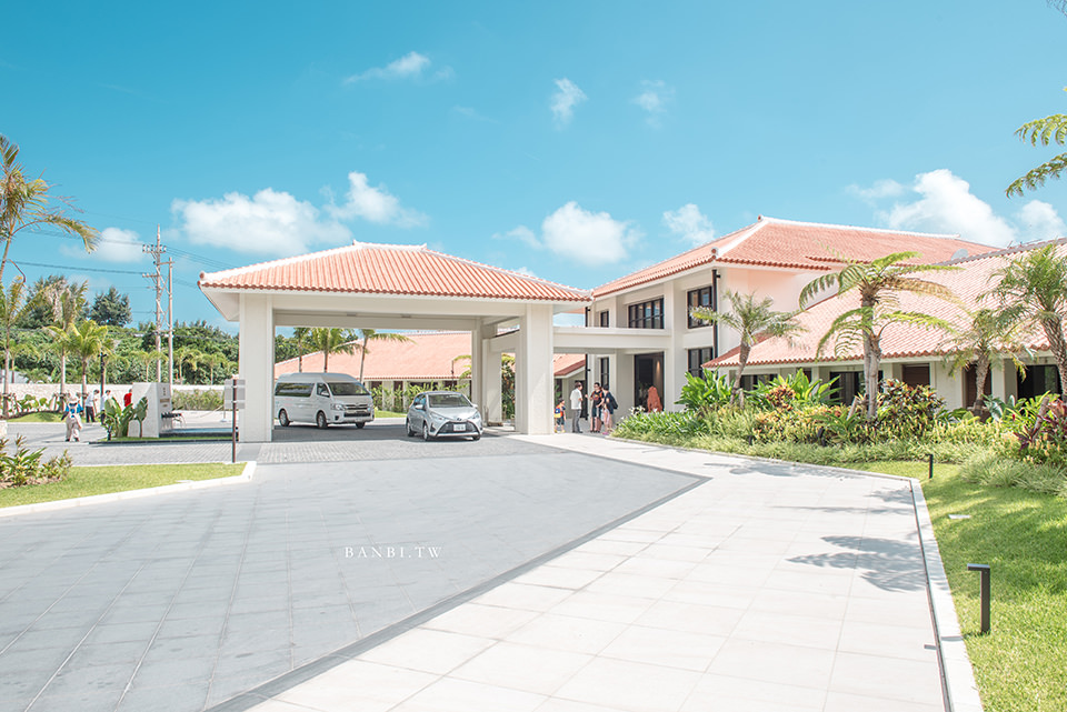 富崎海灘渡假酒店 FUSAKI BEACH RESORT HOTEL&VILLAS」飯店的屋頂上是沖繩的紅瓦建築,與如海浪般白的建築物本體、棕櫚樹搭配著,充滿海島度假的感受。