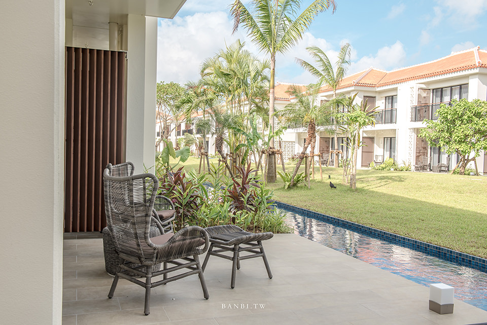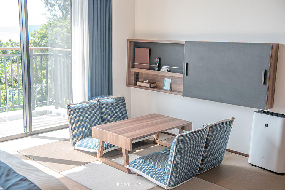 NORTH WING 海景雙人房分為洋式,或是和洋房,差別在洋式是沙發與小茶几,和洋房則是沖繩的榻榻米(特色是正方形的形狀)與和室椅。