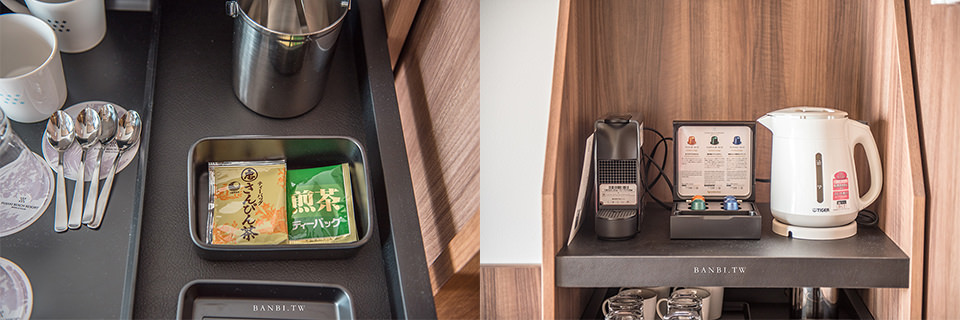 房間裡有膠囊咖啡機、茶包、熱水器,讓房客可在房間內泡杯茶或咖啡享受。