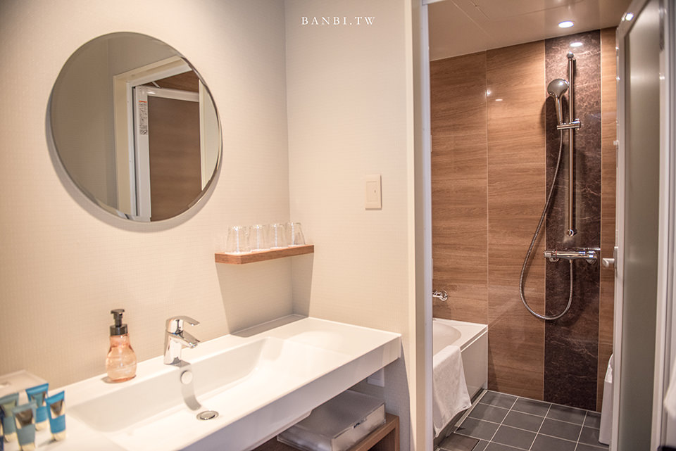 乾溼分離的浴室,更衣區、洗手檯、化妝鏡與各種備品,供應齊全。