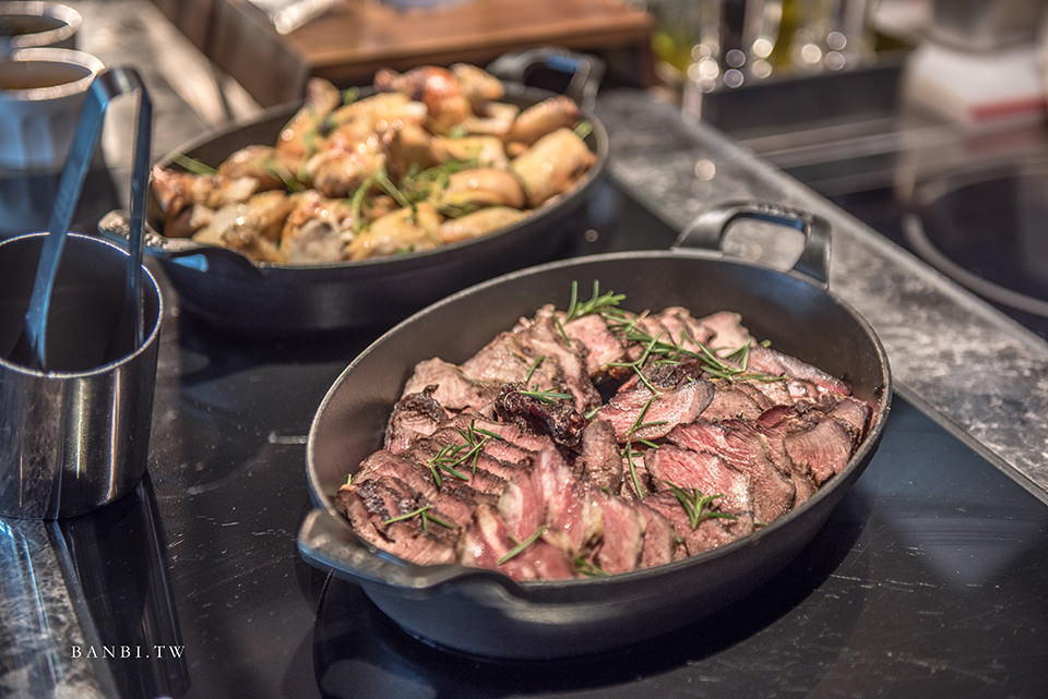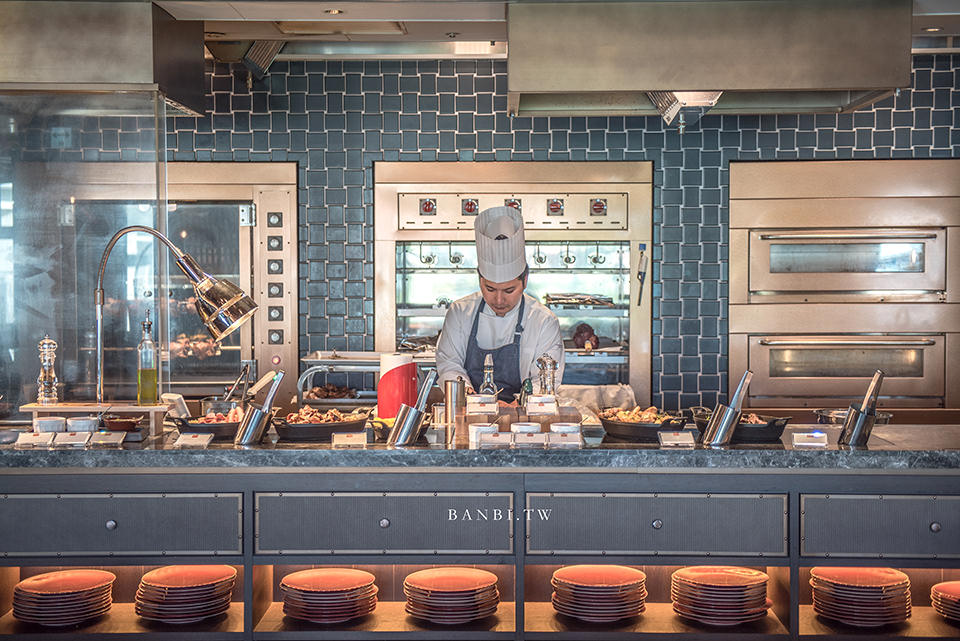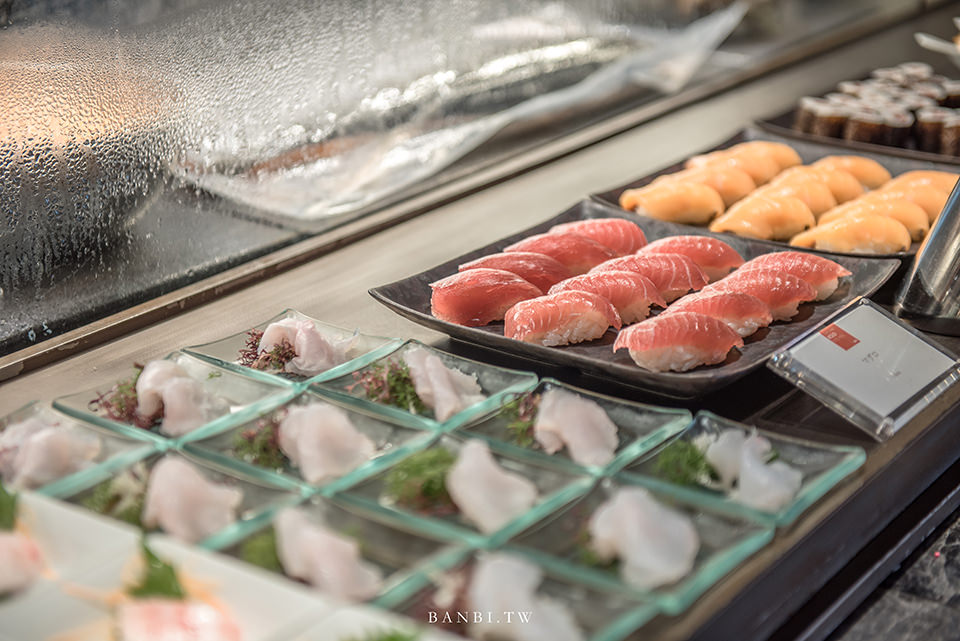 看起來好吃的烤牛排、烤雞、火腿、德式香腸、各種咖哩、炸天婦羅、海鮮飯、生魚片、握壽司、冷菜、甜點、水果、生菜等,琳瑯滿目的菜色,在食材烹煮與配色擺盤上皆很用心,引人食慾。