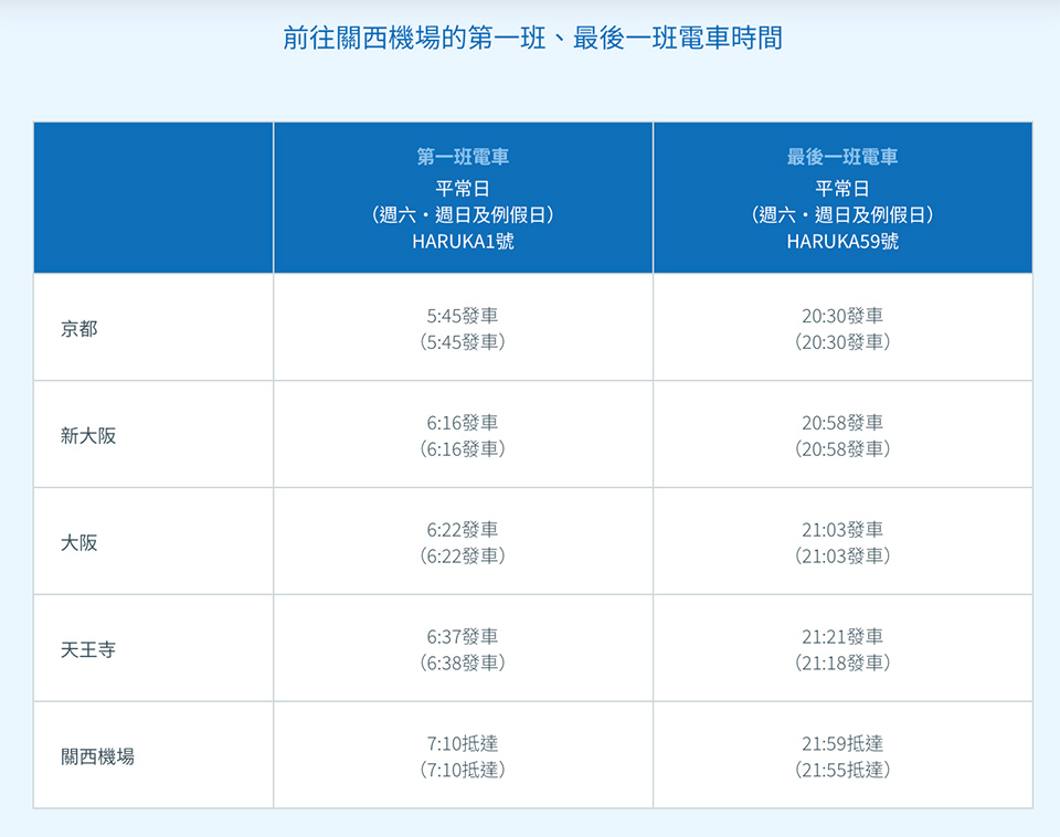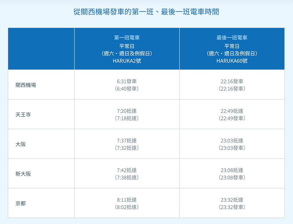 關西機場發車第一班車、末班車時間以及抵達天王寺、大阪、新大阪、京都時間。