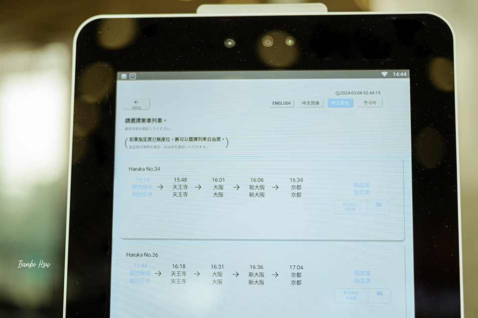 拿取事先在網路上購買的HARUKA車票提供的QR Code(可將條碼存放在手機或是列印成紙張進行掃描),對著機器右下方掃瞄觸掃描條碼,再依序選擇希望搭乘的車班。