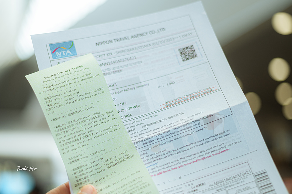 取票步驟完成後,機器會列印淡綠色的長條紙張,紙張上顯示乘車日、列車車次、車號、座位(當時顯示部分座位可自由選擇其一入座)。記得將綠色紙張收好,接下來需走人工窗口,將綠色紙張給閘門旁的車站人員驗票就可前往月台搭HARUKA了。