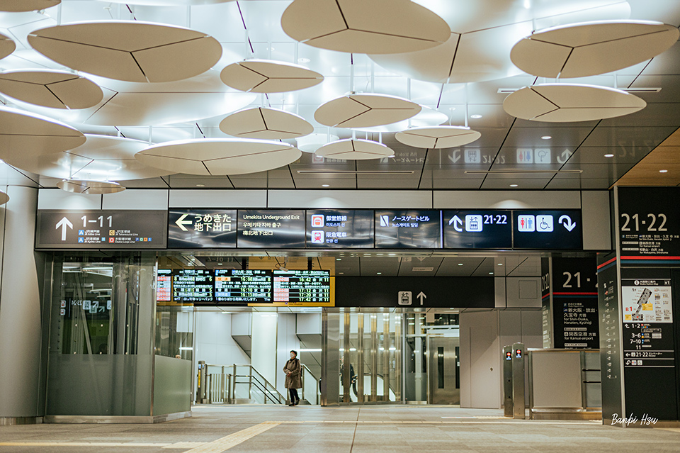 搭乘HARUKA到新的「大阪站」後下車,出去後的出口名為梅北地下出口(うめきた地下出口),接著順著指示就能到達梅田地區了。車站設計成現代科技感風格,更設置不少電扶梯、電梯,貼心地為攜帶大型行李或者行動不便者考量。