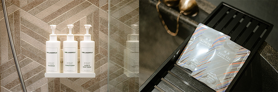 #浴室備品,沐浴乳、洗髮乳到潤髮乳皆是使用「Karl Lagerfeld」品牌檀香木系列,泡澡包則是阿里山高山茶風味的「澡茶」。