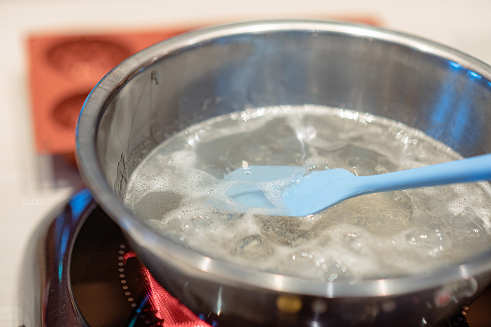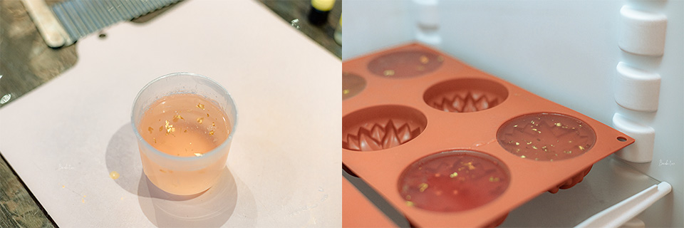 滴入荷荷芭油與紅檜精油,拌入金箔、入模等凝固(放冰箱大概15-20分)。