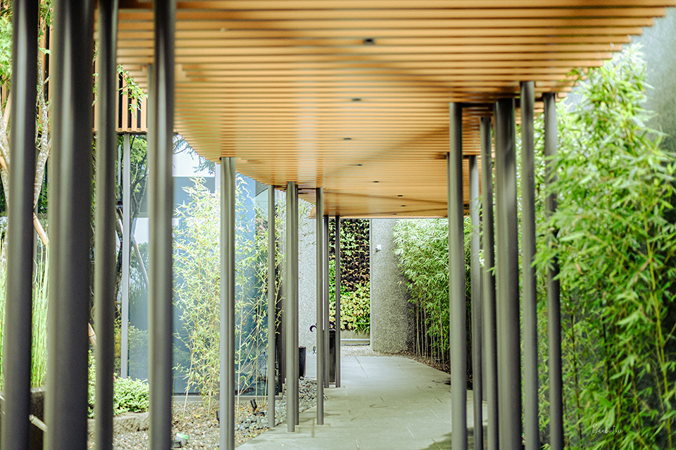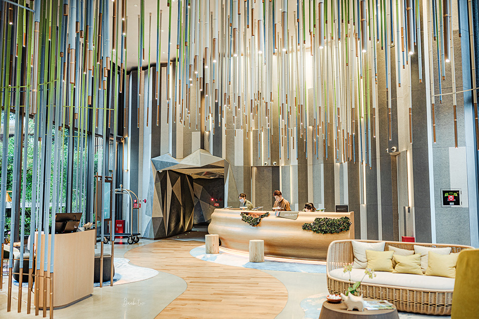 走進大廳前的廊道,有一小片竹林相伴在旁,抬頭一看是木製天花板,這個概念來自阿里山小火車(阿里山森林鐵道)的檜木車廂。