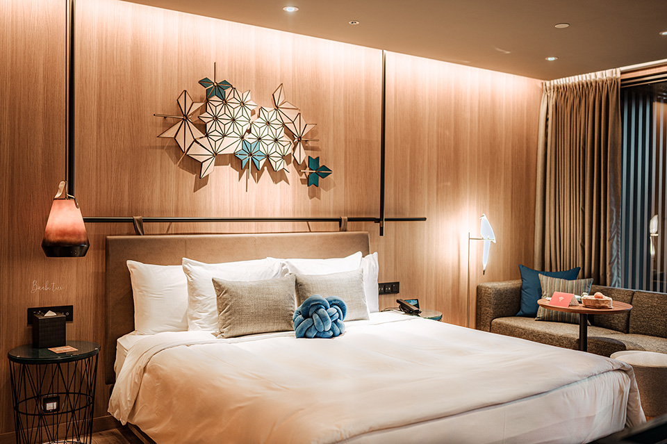 我們的房間以藍色為飾,阿里山英迪格酒店房間顏色也融入鄒族文化在內,將鄒族服飾中代表藍鵲羽毛的藍、白、紅三種顏色融入。