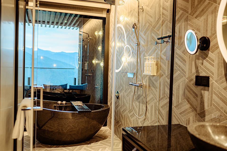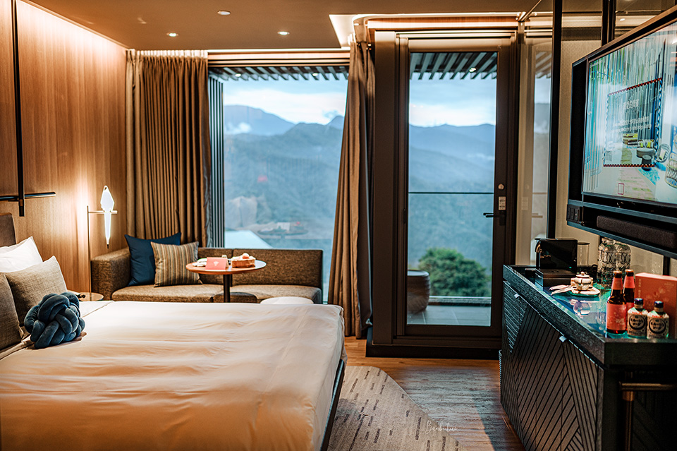 阿里山英迪格酒店房型有精品房、豪華房、開放式套房、單臥套房這四種房型,每一房間都有獨立陽台,若是面山景的房間,坐在陽台時就能看雲海;而我們入住的房型是二人房「精品房」附浴缸(分雙床房、一大床房),有35平方米大。