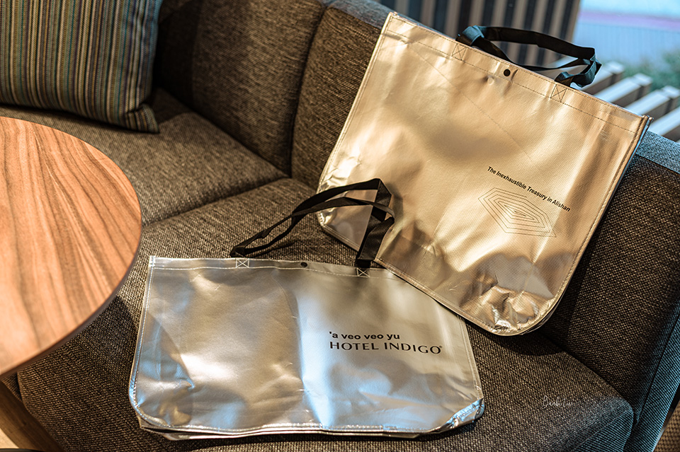 在衣櫃處見到帶有金屬光澤的大提袋,經由飯店人員介紹,這提袋房客可自行攜帶回去作為購物袋等使用。