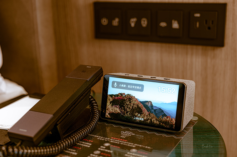 床頭的智能管家裝置「小美犀」,透過音控就能開關房間內的燈源與電視、調整房間空調、設定鬧鐘與客房服務、播放音樂,也可查詢日出時間、阿里山景點資訊、酒店館內設施。