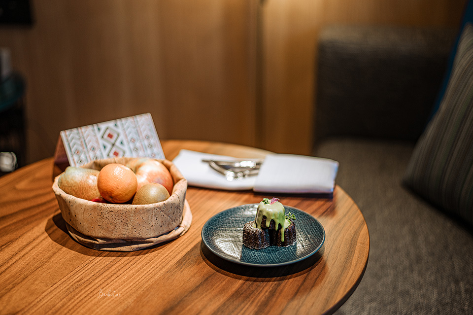 # 客房招待水果、小點,當時有一袋品質好的新鮮水果與抹茶可麗露。
