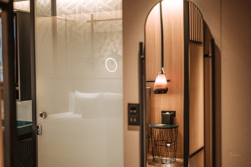 #以木屏風隔開主臥房和設計感衣櫥,像是玄關一樣。