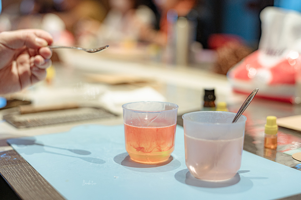 分好皂液後進行調色(有紅、黃二色),好友調了個如同阿里山夕陽般的血橙,而我調了淡淡的阿里山粉櫻。