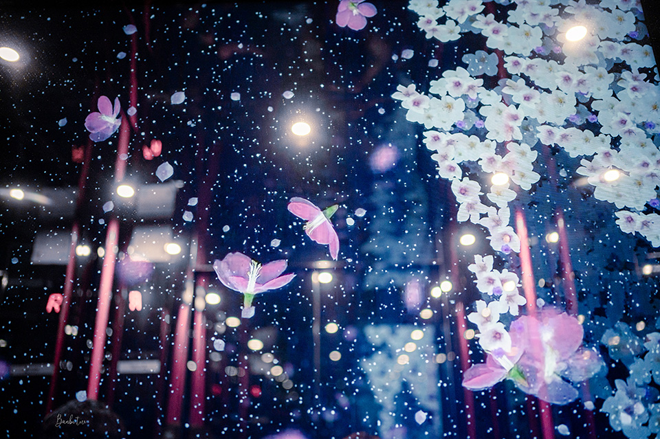 #電梯裡的櫻花,白日時背景為藍天、夜晚時變換為黑夜;電梯上升時櫻花自底往上飛升,電梯下降時櫻花翩翩落下,好美。