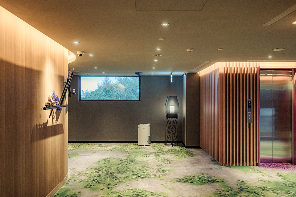 自滿開著櫻花的電梯踏入房間所在樓層,地毯上的圖樣也似阿里山上的森林。