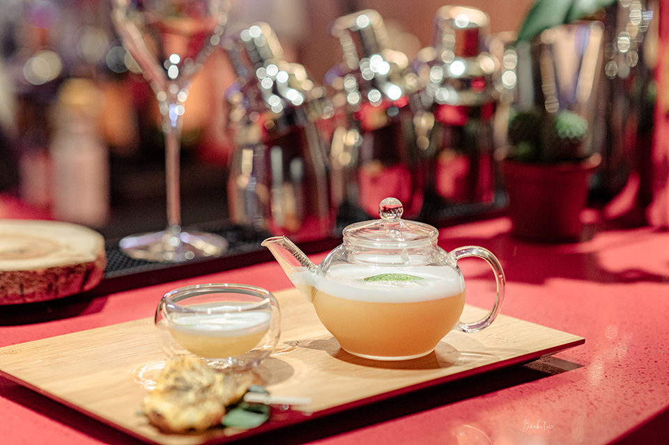 可愛的調酒師為喜歡甜調的我們推薦的「真心鳳茶」,結合阿里山茶以及嘉義民雄鳳梨,使用烏龍茶、蜜李和鳳梨做出如同果茶一般清爽順口的調酒,搭配茶具更有特色,此外還能品嚐他們酒吧自烘的鳳梨乾。