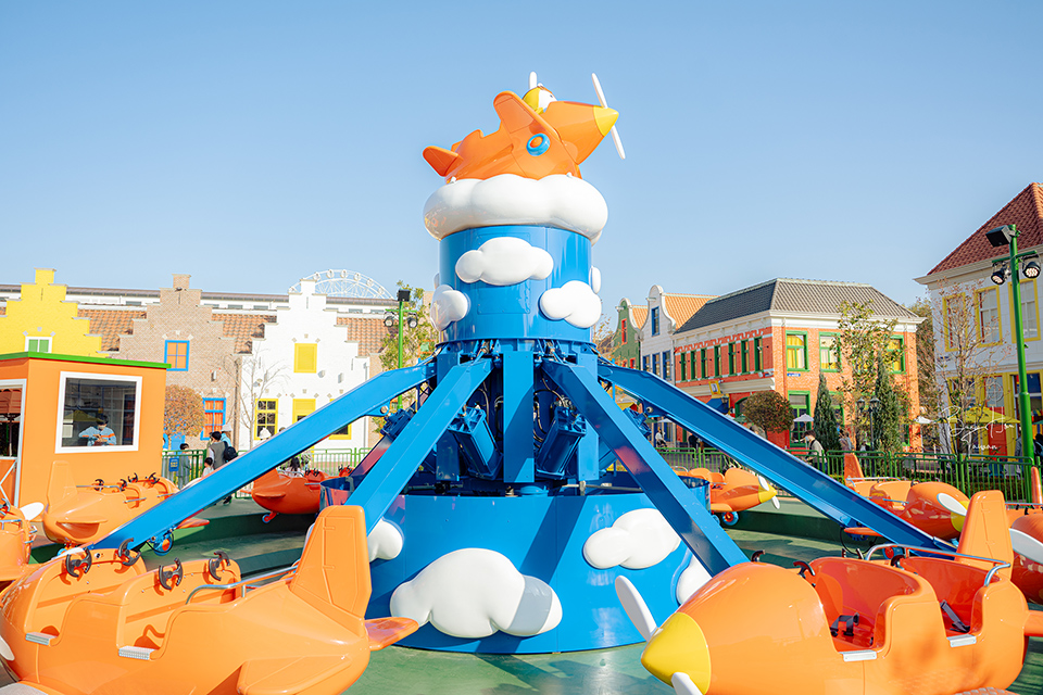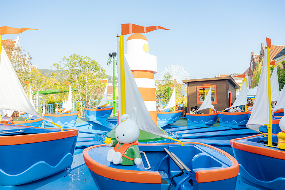 可以自己控制升降高度的飛行遊樂設施,坐在橘色的飛行機上方360度環視整座Miffy夢幻小鎮景色。