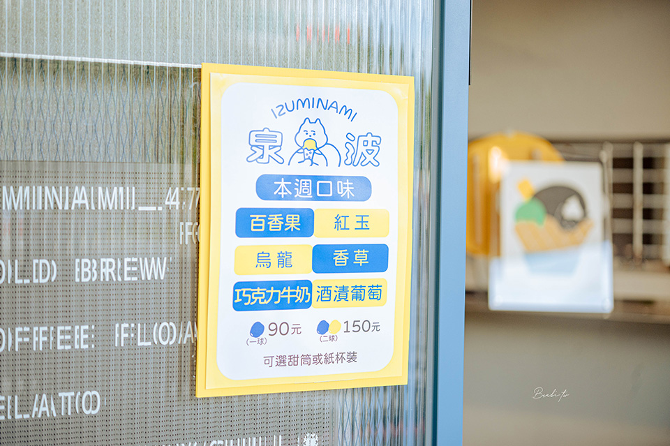 Izuminami 泉波手工冰淇淋每週的口味不同,前往的那週口味為百香果、巧克力牛奶、酒漬葡萄、香草、紅玉、烏龍茶,可選單球$90元或兩球$150元。