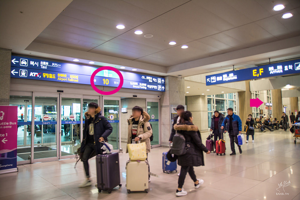 可以看到照片中我用桃紅色圈起來的數字便是指10號出口,而一旁的桃紅色箭頭就是KT Olleh仁川機場櫃位。