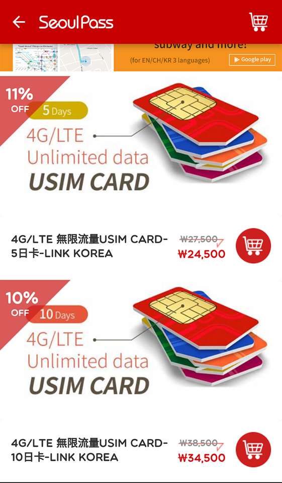 這次使用常有韓國旅遊優惠券的SEOUL PASS,在官網上可以找到韓國電信公司KT Olleh推出的五日或十日卡"4G/LTE 無限流量USIM CARD"。