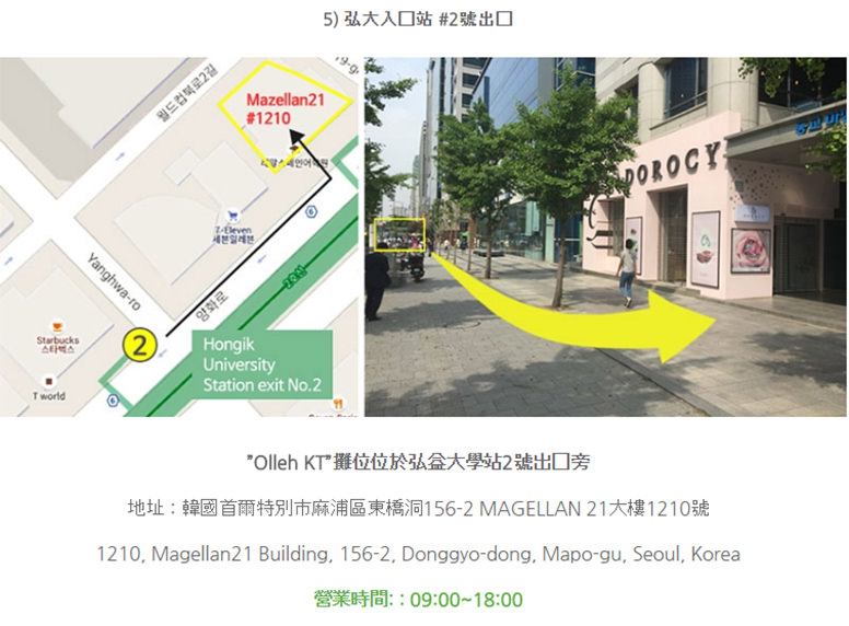 5.弘大入口站 #2號出口:弘益大學站2號出口旁/營業時間:09:00~18:00