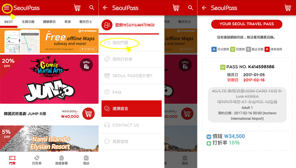 開啟SEOUL PASS的APP,登入後按下左圖我圈起來的地方→接著會挑出像中間圖示的地方,按下"我的門票"→就會跑出像是右圖的資訊(因為我是在取卡後截圖,所以會有些不同)(購買日是購買此券的日期,到期日則是領取卡的時間)。