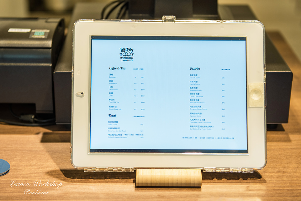 菜單為在櫃檯前的平板,販售的咖啡、茶飲、吐司、三明治或是甜點品項都寫在上面了。