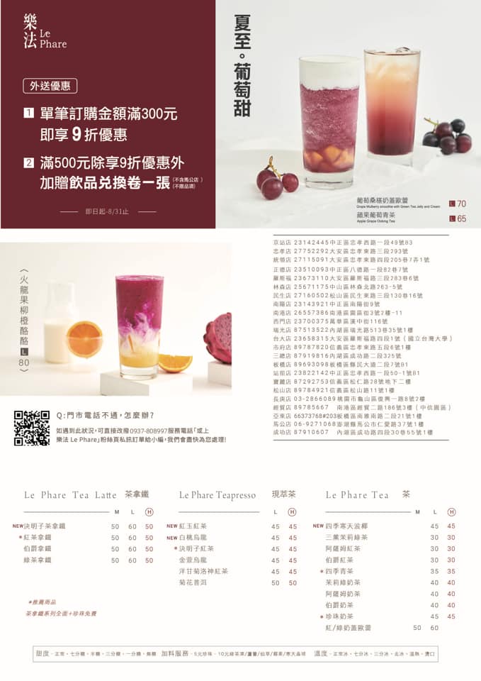 2020.08月樂法 Le Phare最新飲料菜單,由於水果飲品有季節限定關係,新品請以樂法 Le Phare公佈菜單為主。