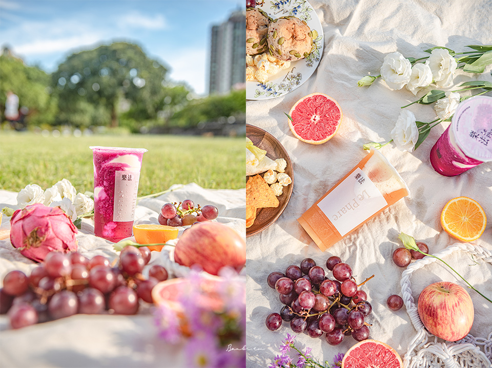 我們帶了喜歡的麵包、甜點、零食和水果,和樂法的五樣飲料(葡萄桑椹奶蓋歐蕾、蘋果葡萄青茶、蘋果鳳梨伯爵、楊枝芒果酪酪、火龍果雲朵冰沙),一起走到華山1914文化創意園區東二四連棟後方的草地上野餐