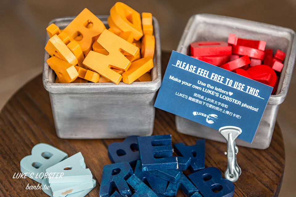 LUKE’S LOBSTER為了台灣一號店的開幕,特地先推出四種顏色(淺藍、深藍、橘色、紅色)的英文字母,讓客人可以排自己喜歡的英文單字或是名字來拍照(拍完後請記得將字母積木放回小籃子內,好讓下位客人可以拍照使用喔!)