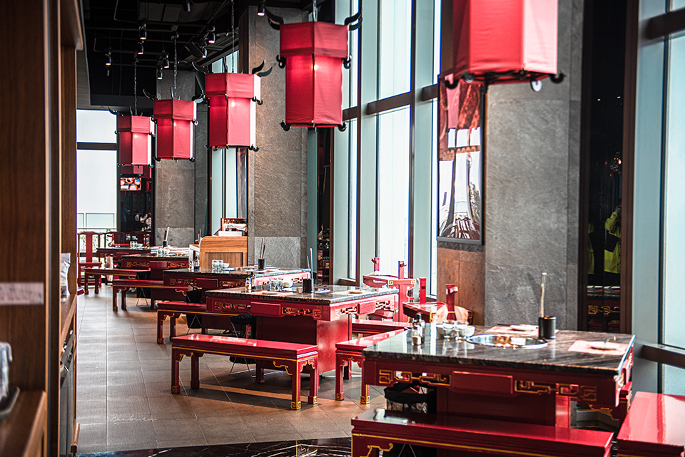 中國風裝潢的麻辣45,店裡桌椅和吊燈則以紅色色澤為主,就像是辣椒的紅色,呈現新潮且氣派的風格。